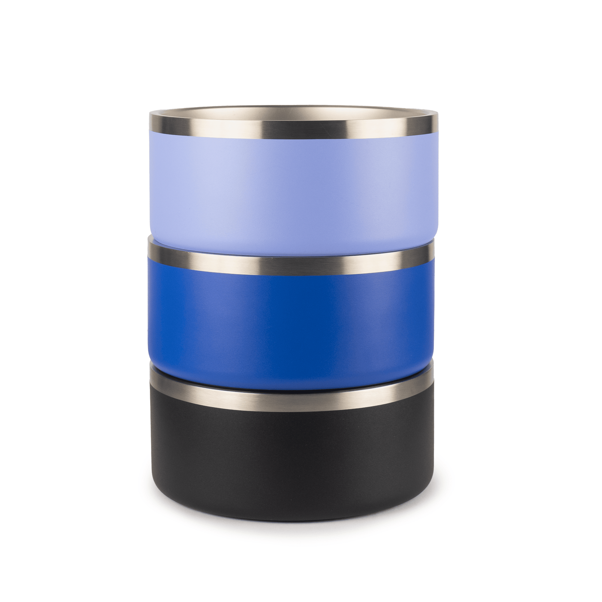 Available Colors: Periwinkle, Blue, Black- Set includes: Three stainless steel bowls